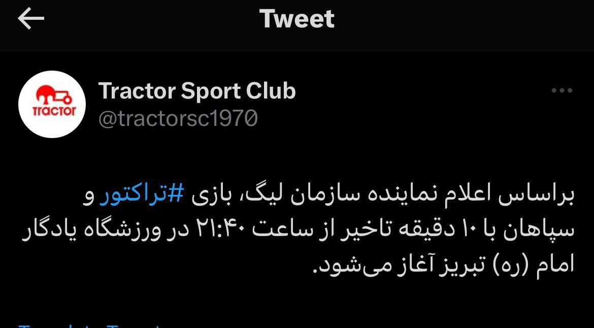 این درحالی است که لحظاتی پیش صفحه رسمی باشگاه تراکتور تبریز با اعلام این خبر نوشت: «براساس اعلام نماینده سازمان لیگ بازی سپاهان و تراکتور با ۱۰ دقیقه تاخیر و از ساعت ۲۱:۴۰ در ورزشگاه یادگار امام تبریز آغاز میشود»