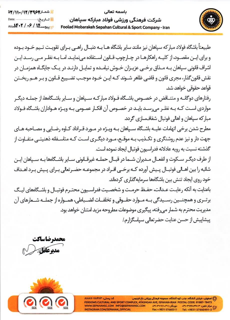 به گزارش و به نقل از باشگاه فولاد مبارکه سپاهان، محمدرضا ساکت، مدیرعامل باشگاه فولاد مبارکه سپاهان با ارسال نامهای به رئیس فدراسیون فوتبال از صحبتهای کارشناسی نشده برخی از اعضای این فدراسیون انتقاد نموده و نسبت به برخی حواشی واکنش نشان داد.